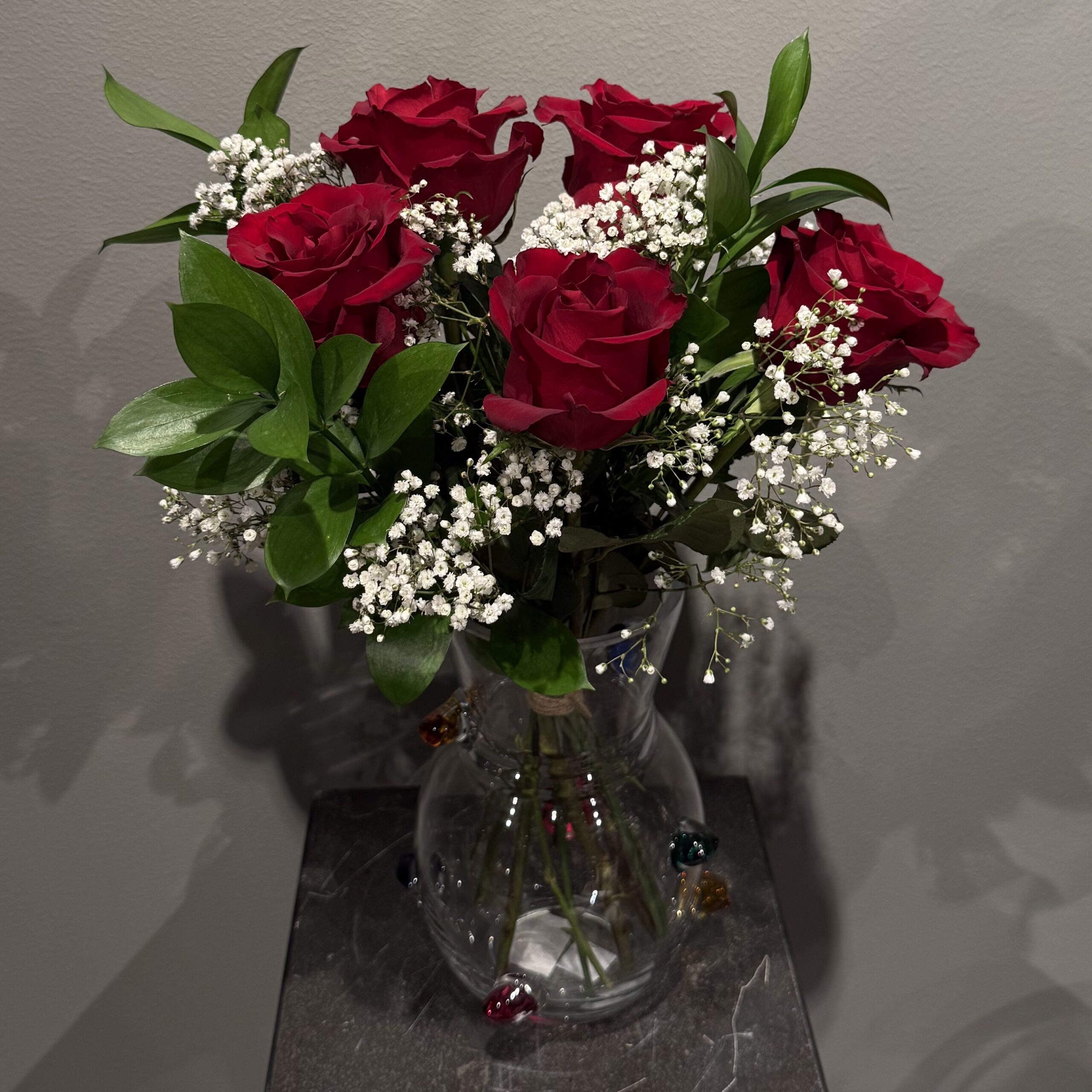 Eldglimt är en kraftfull bukett med röda rosor, mjuk brudslöja och friskt grönt. En tidlös symbol för passion och värme. Perfekt när du vill förmedla starka känslor.