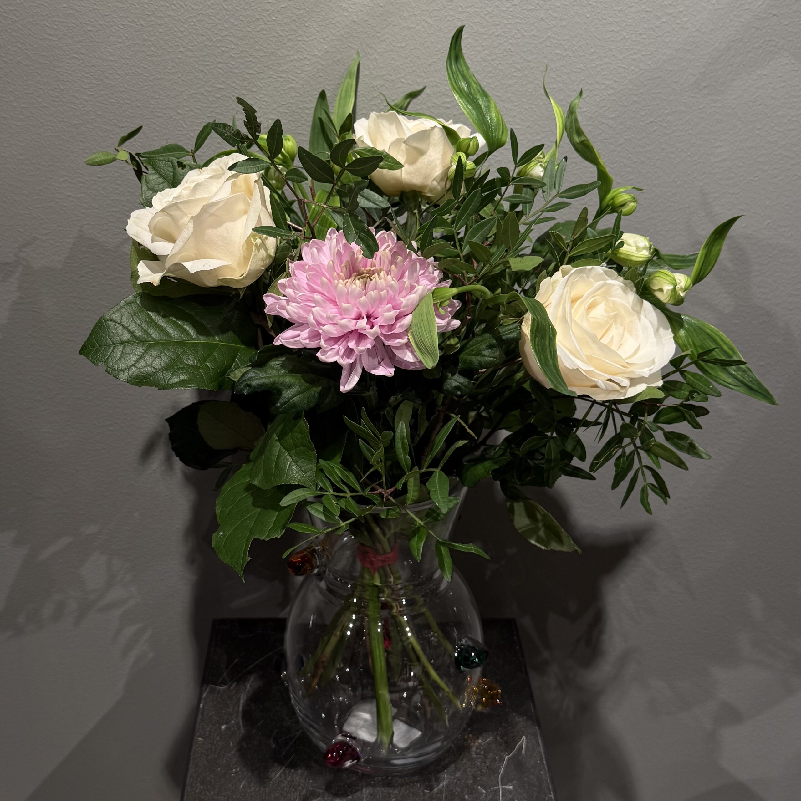 En ljus och stillsam bukett i vitt och ljusrosa med rosor, krysantemum och alstroemeria. En bukett som förmedlar lugn, omtanke men även hopp i svåra stunder.