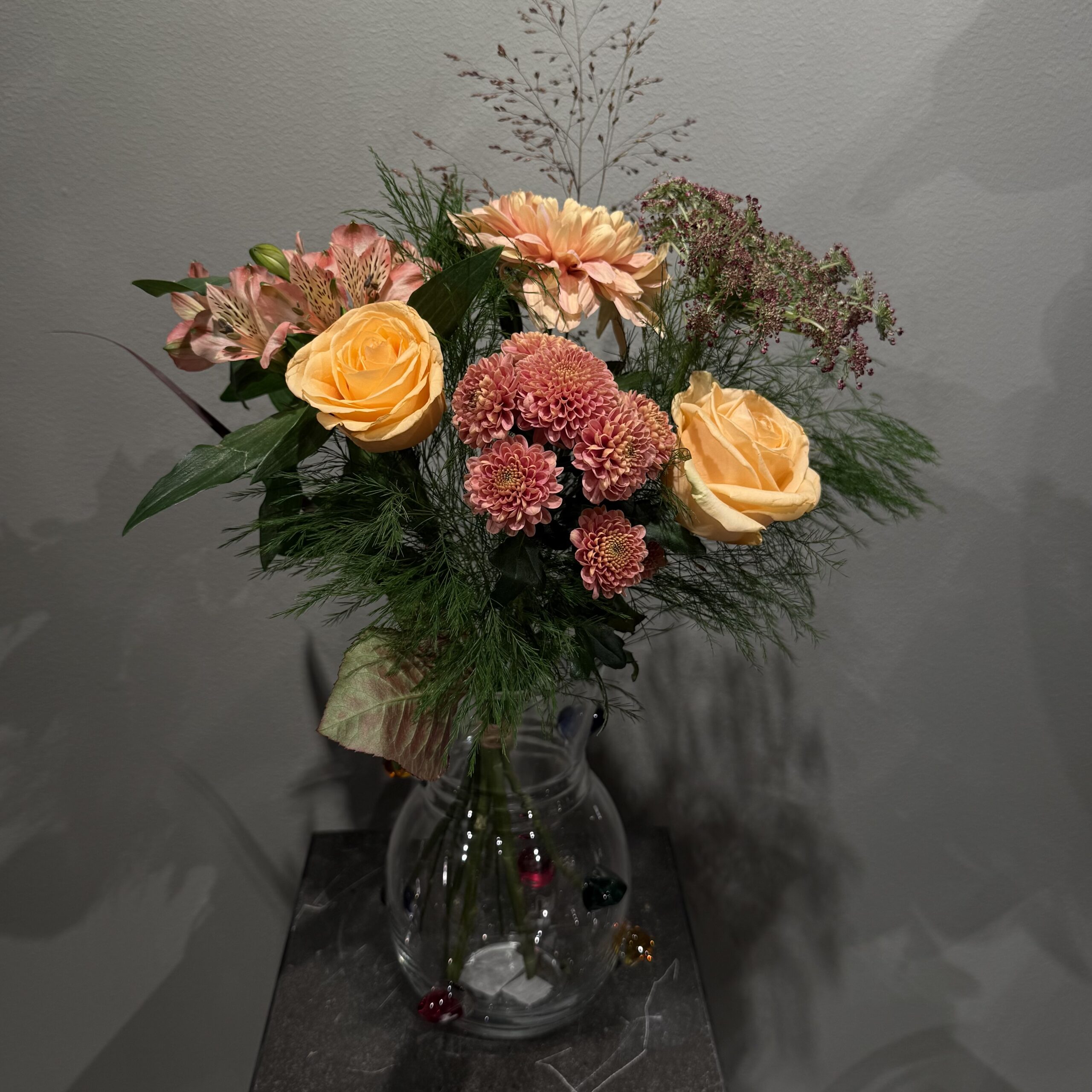 En bukett från oss är alltid bunden av oss i butiken och blommorna är noga utvalda för att passa säsongen. Vi binder din bukett med omsorg för hantverket och levererar lokalt med en trygg transportör som vet blommans bästa.