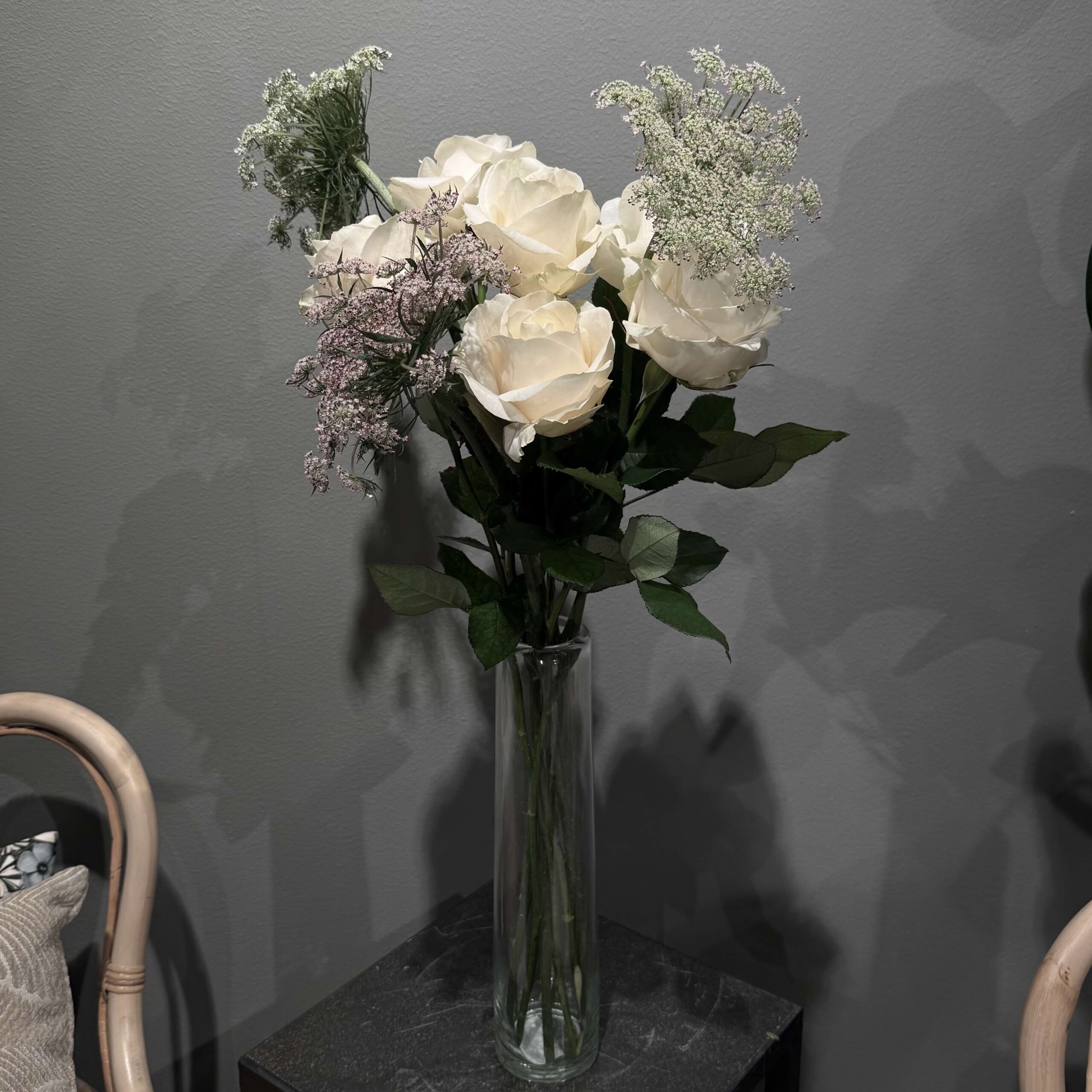 Klassisk stilfull bukett med 7 vita rosor och ljuv morotsblomma.