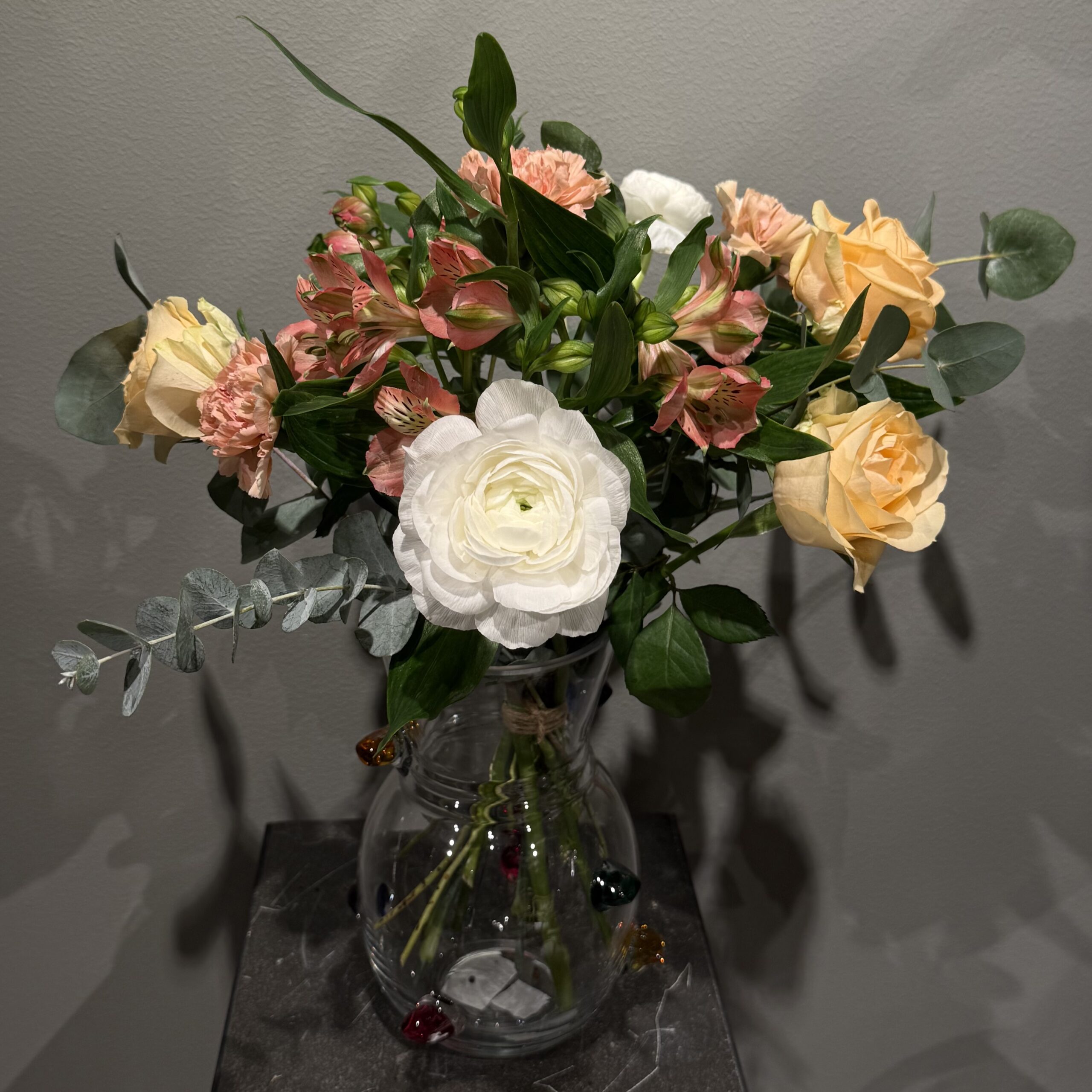 Stor elegant bukett med ranunkel, rosor, alstromeria och nejlika.