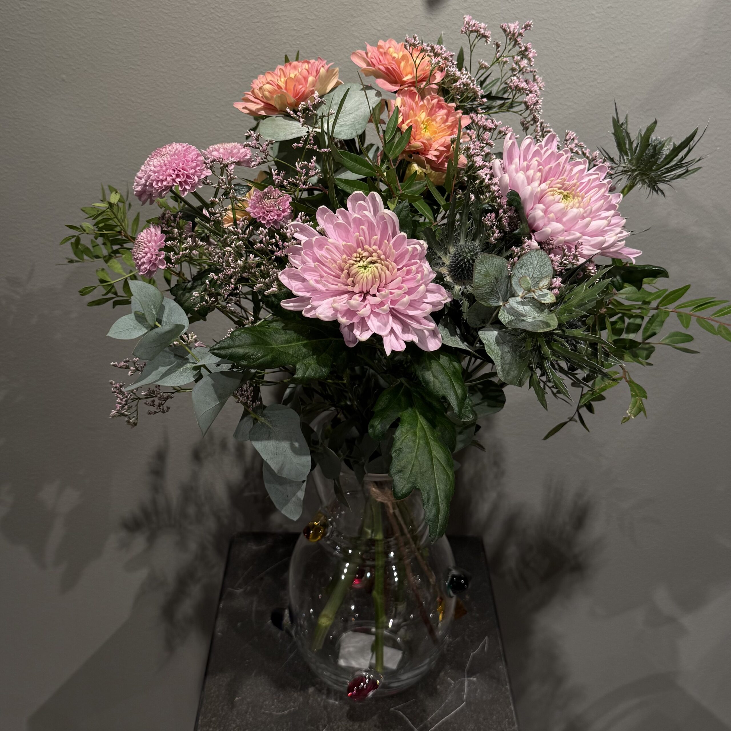 Fyllig bukett med krysantemum i olika storlekar.